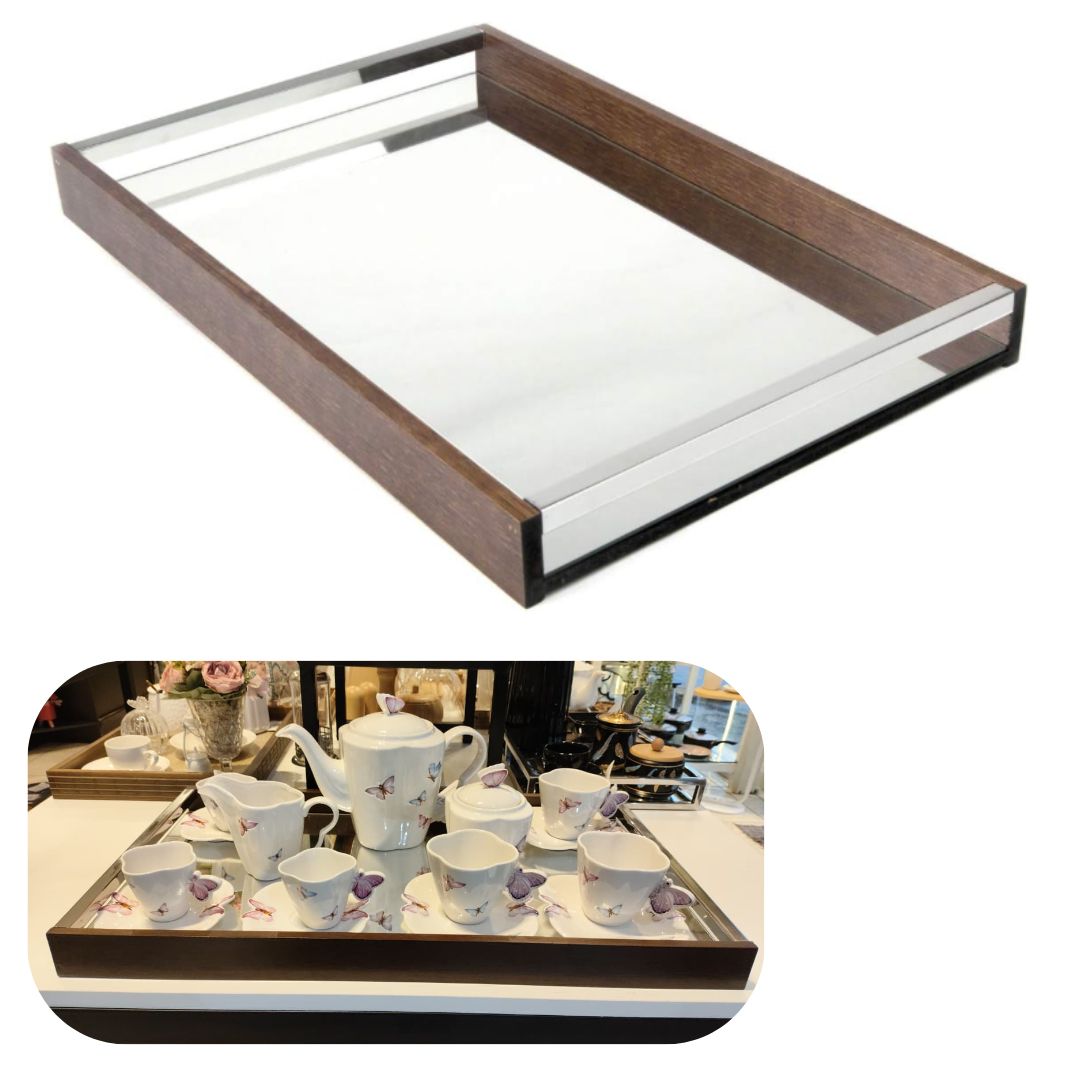 A bandeja, confeccionada em madeira e detalhes com espelho, proporciona uma atmosfera acolhedora e harmoniosa à sua casa.