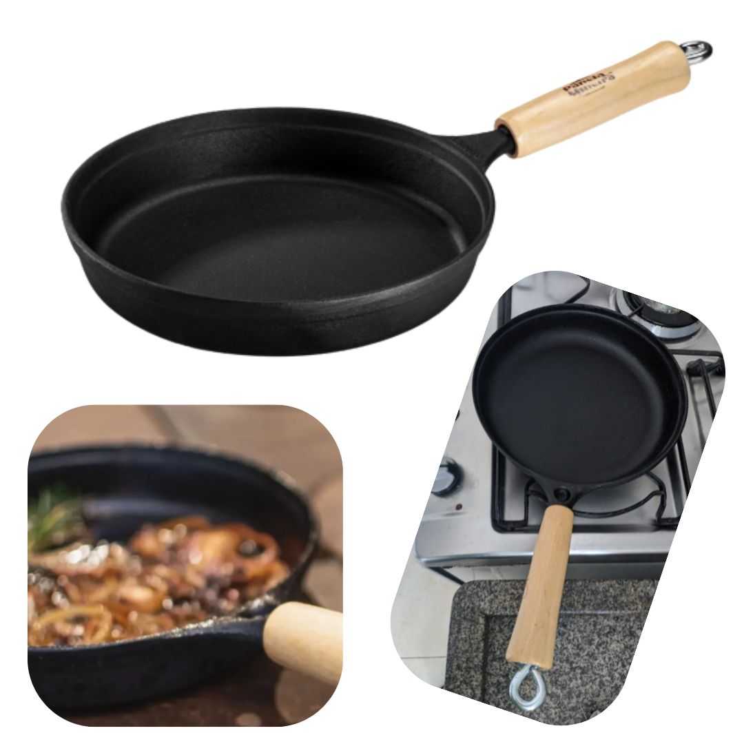 - Seu design proporciona maior segurança no manuseio, com cabo de madeira espaçoso que possibilita uma transferência segura do fogão para a mesa.