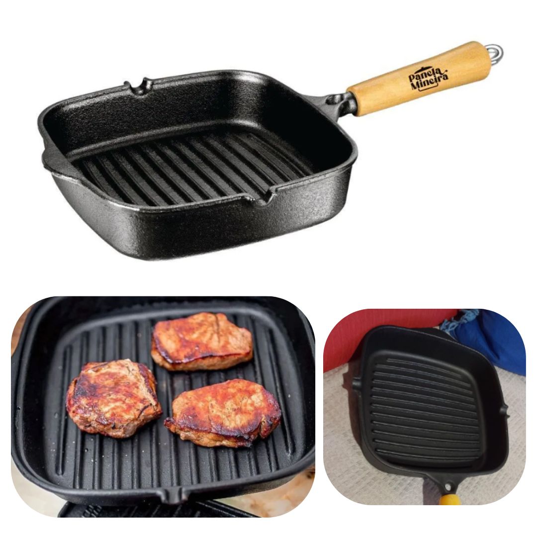 A Frigideira Grill Quadrada Cabo de Madeira da Panela Mineira® é um produto moderno, prático e eficiente, que apresenta alto desempenho no preparo de diversas receitas. Sua marca registrada são as ondulações em seu fundo, que permitem o escoamento da gordura da peça que está sendo cozida.