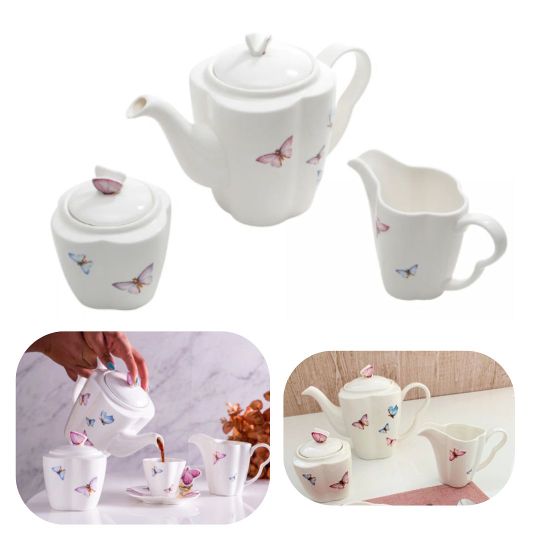 Sirva em grande estilo com Conjunto para café contendo um Bule, um Açucareiro e uma Leiteira, da linha Borboletas feito de porcelana na cor branca com detalhes coloridos e de marca renomada Wolff.